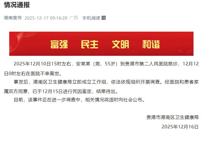 事发后,港南区卫生健康局立即成立工作组,依法依规组织开展调查。经医院和患者家属双方同意,已于12月15日进行死因鉴定,结果待出。