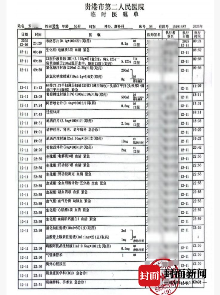 2025年12月10日15时左右,安某某(男,55岁)到贵港市第二人民医院就诊,12月12日0时左右在医院不幸离世。
